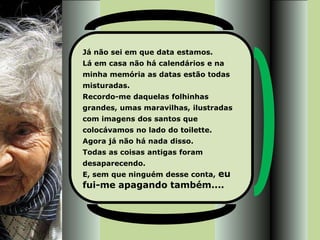 A narradora, uma idosa, sente-se invisível para a família. Ela foi gradualmente esquecida e isolada, trocada para quartos menores, e agora vive sozinha em um quarto pequeno e frio. Quando tenta conversar com a família ou ajudar, é ignorada como se não estivesse lá. Ela percebe que se tornou invisível para todos.