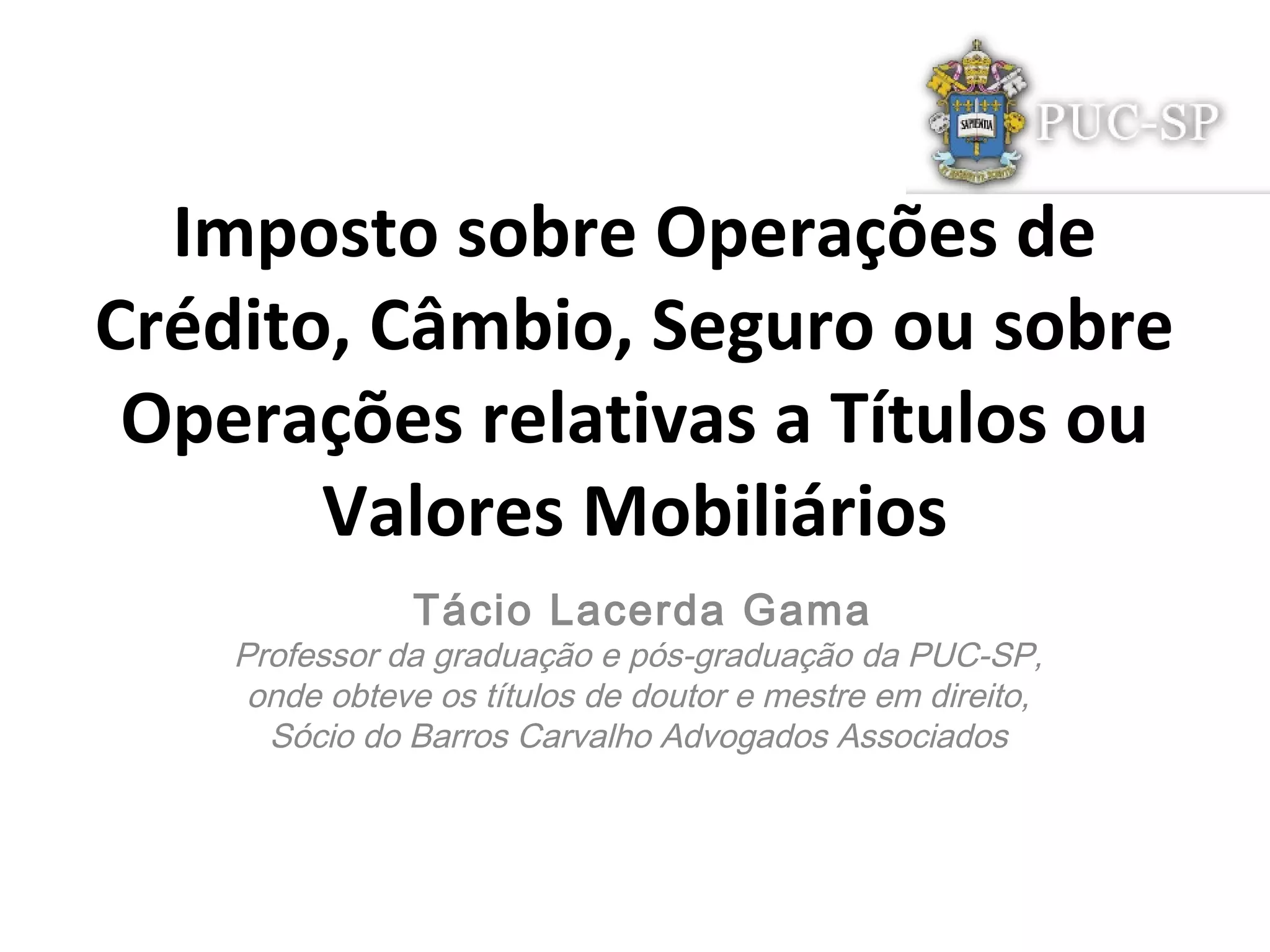 O documento discute a legitimidade e a apuração do Imposto sobre Operações de Crédito, Câmbio, Seguro ou sobre Operações relativas a Títulos ou Valores Mobiliários (IOF) em 3 frases: 1) A legitimidade do IOF é analisada por meio da competência tributária e pode incidir sobre operações de crédito, câmbio, seguro e títulos/valores mobiliários. 2) Sua apuração é feita pela análise da Regra de Incidência Material e Temporal. 3) O documento