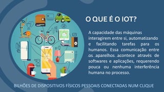 O documento discute a Internet das Coisas (IoT), prevendo que até 2020 haverá 25 bilhões de dispositivos conectados em todo o mundo. A IoT permite que dispositivos se comuniquem entre si para automatizar tarefas, com aplicações populares na automação residencial. No entanto, a crescente coleta e compartilhamento de dados também traz riscos cibernéticos que exigem proteção. A IoT industrial monitora processos de produção para melhorias, enquanto na agricultura pode automatizar irrigação e respostas a condições clim
