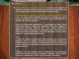 O documento descreve as instalações e sistemas do Instituto de Permacultura da Amazônia, que aplica princípios de permacultura para cultivar alimentos de forma sustentável. A permacultura busca integrar recursos naturais como solo, água e luz solar de maneira inteligente para garantir eficiência, auto-suficiência e sustentabilidade. O instituto possui hortas, laboratórios, criação de animais e sistemas de captação e tratamento de água projetados de acordo com esses princípios.