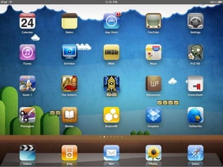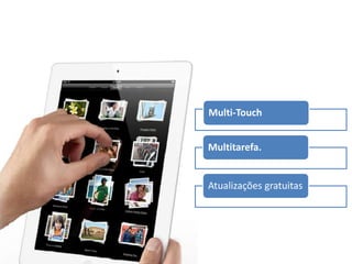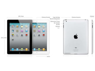 O documento descreve o iPad, incluindo seu hardware, conectividade Wi-Fi e 3G, sistema operacional iOS e aplicativos, acessórios como adaptador de vídeo e kit de câmera, e impressão sem fio AirPrint. Mais de 200.000 aplicativos estão disponíveis para iPad.