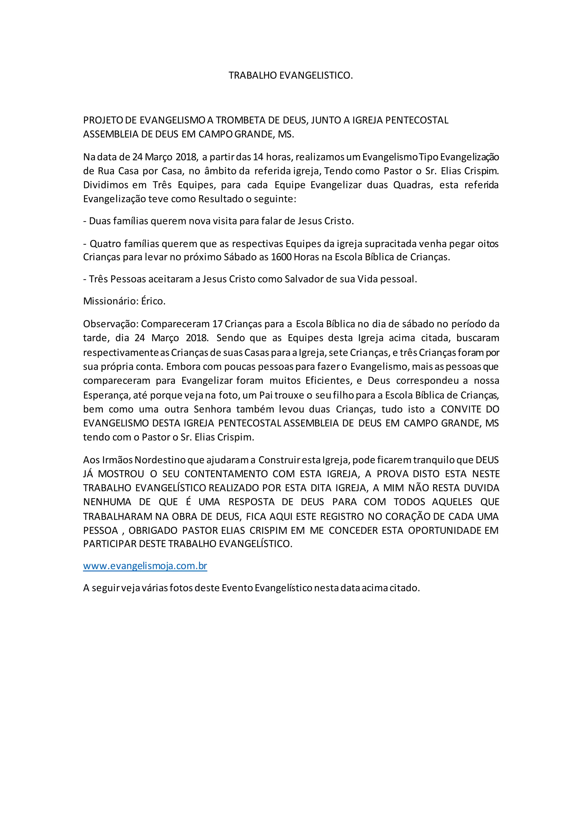 - Uma igreja realizou um evangelismo de casa em casa dividindo-se em três equipes para evangelizar duas quadras.