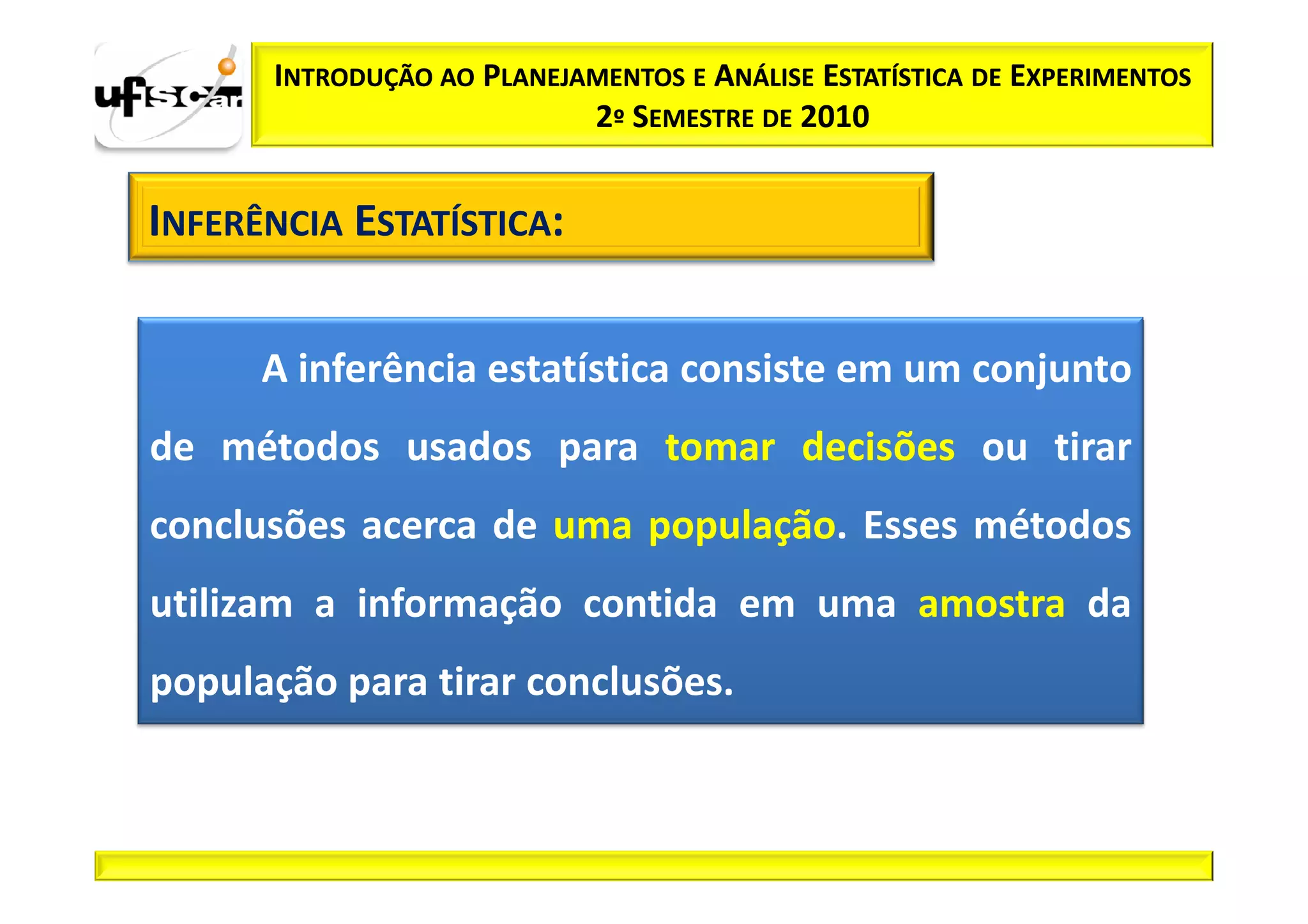 O documento apresenta os conceitos fundamentais de inferência estatística, incluindo: (1) estimação pontual e intervalar, (2) teste de hipóteses, (3) distribuição amostral da média para amostras retiradas de populações normais. Exemplos ilustram como esses métodos são usados para tomar decisões com base em dados amostrais.
