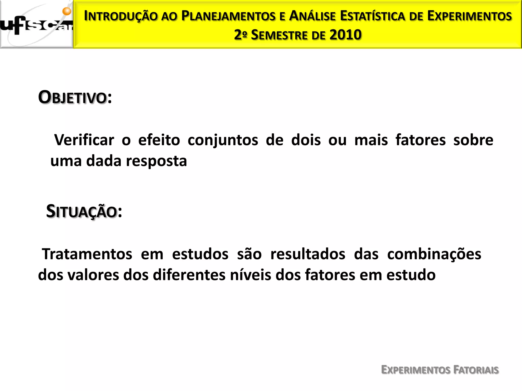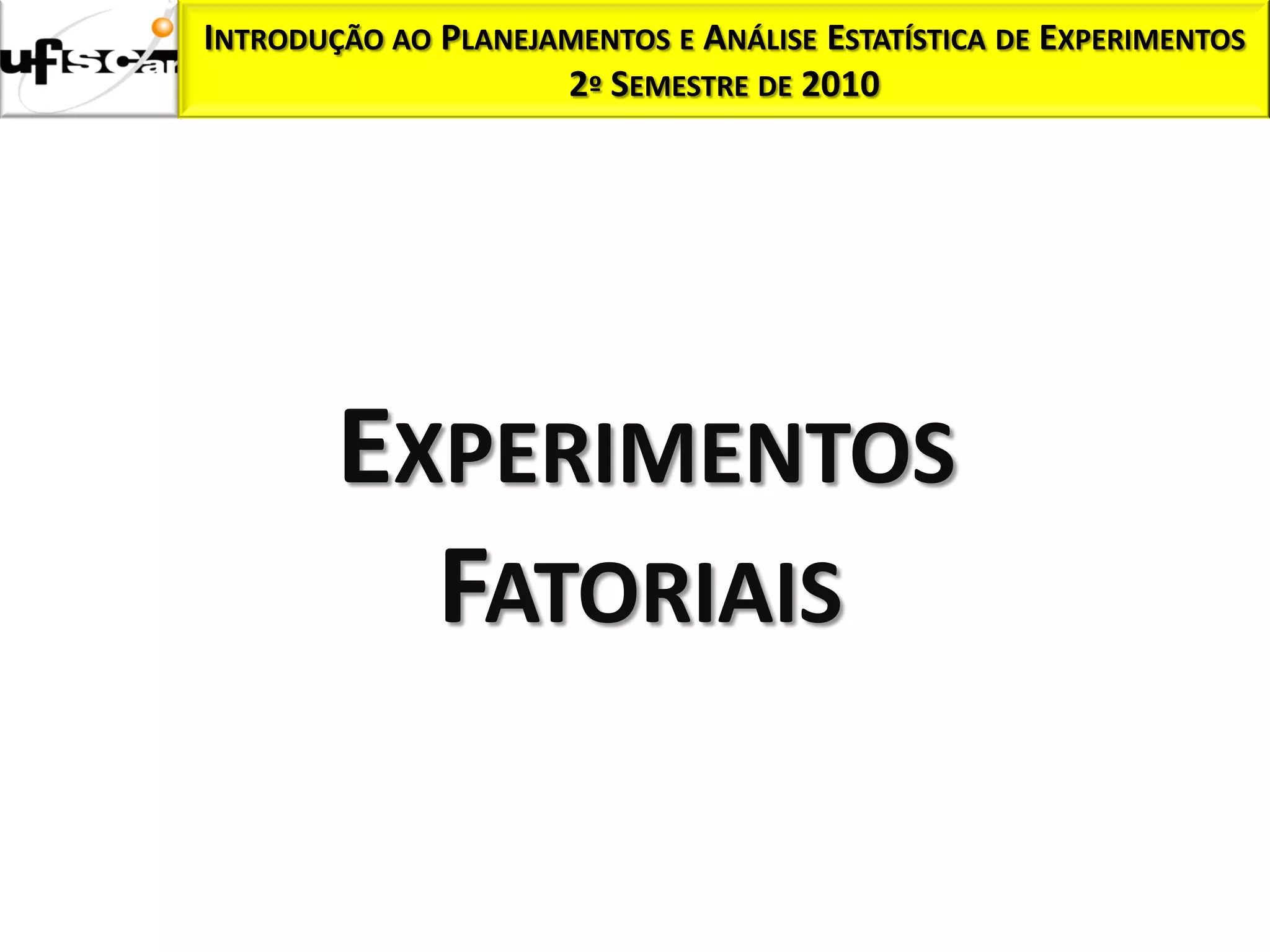O documento introduz experimentos fatoriais, que verificam o efeito conjunto de dois ou mais fatores sobre uma resposta. Explica que os tratamentos são as combinações dos níveis dos fatores e apresenta um exemplo com raça animal e tipo de ração como fatores. Também discute a análise dos efeitos principais e de interação entre os fatores para identificar se um fator influencia os resultados do outro.