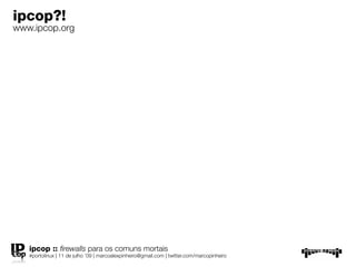 O documento descreve o firewall IPCop, destinado a redes domésticas e pequenos escritórios. O IPCop oferece configuração automática e interface gráfica simples, é desenvolvido com software livre e de código aberto, e requer hardware modesto, tornando-se uma solução estável, segura e gratuita para firewall. O documento também apresenta um estudo de caso no qual o IPCop resolve problemas de segurança, controle de banda larga e acesso à internet em uma escola.