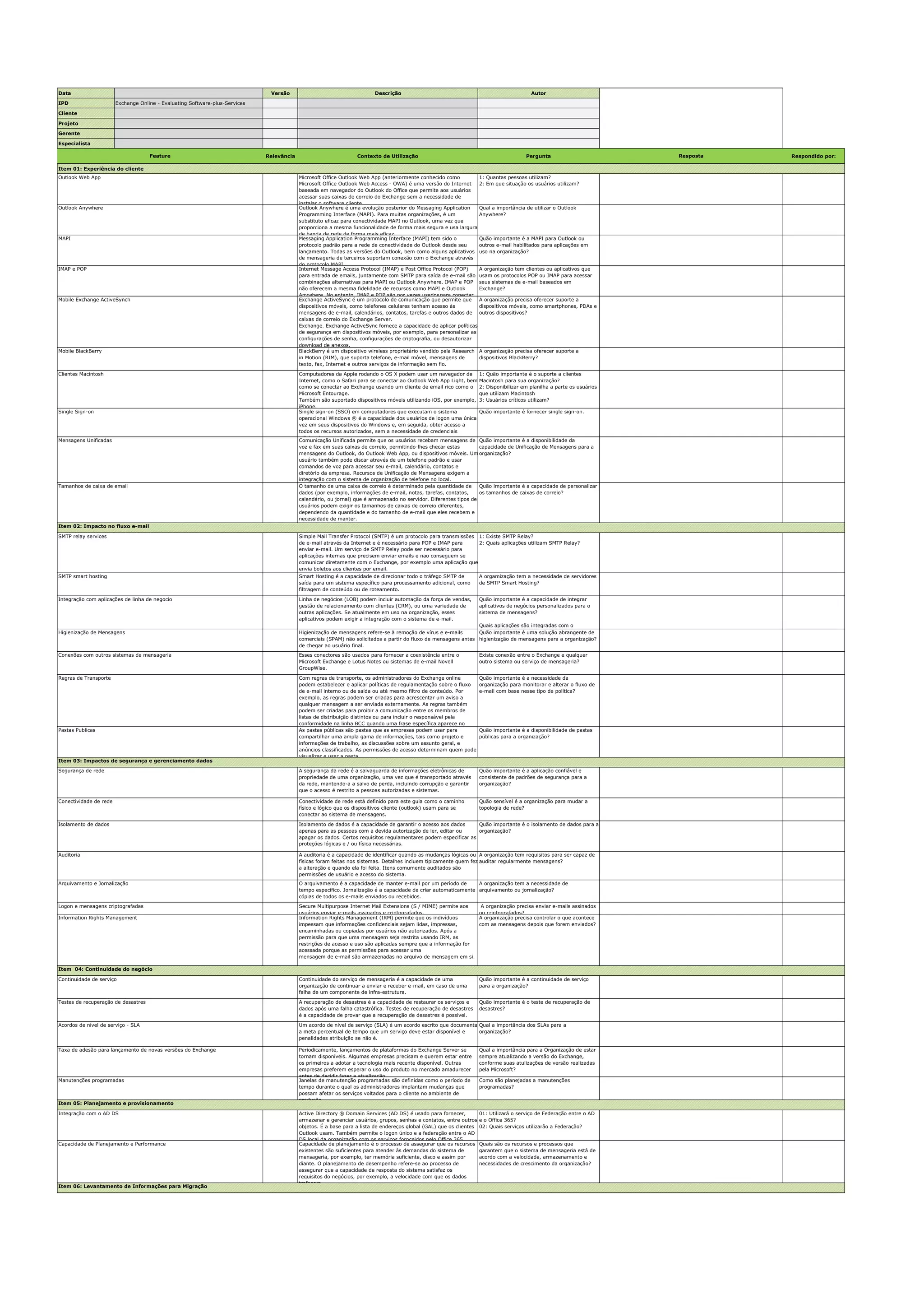 Este documento fornece informações sobre o ambiente de mensageria atual da organização para auxiliar na migração para o Office 365. Aborda tópicos como número de caixas de correio, permissões "Send As", grupos de distribuição e segurança relevantes para dimensionar as licenças e estimar o tempo de migração.