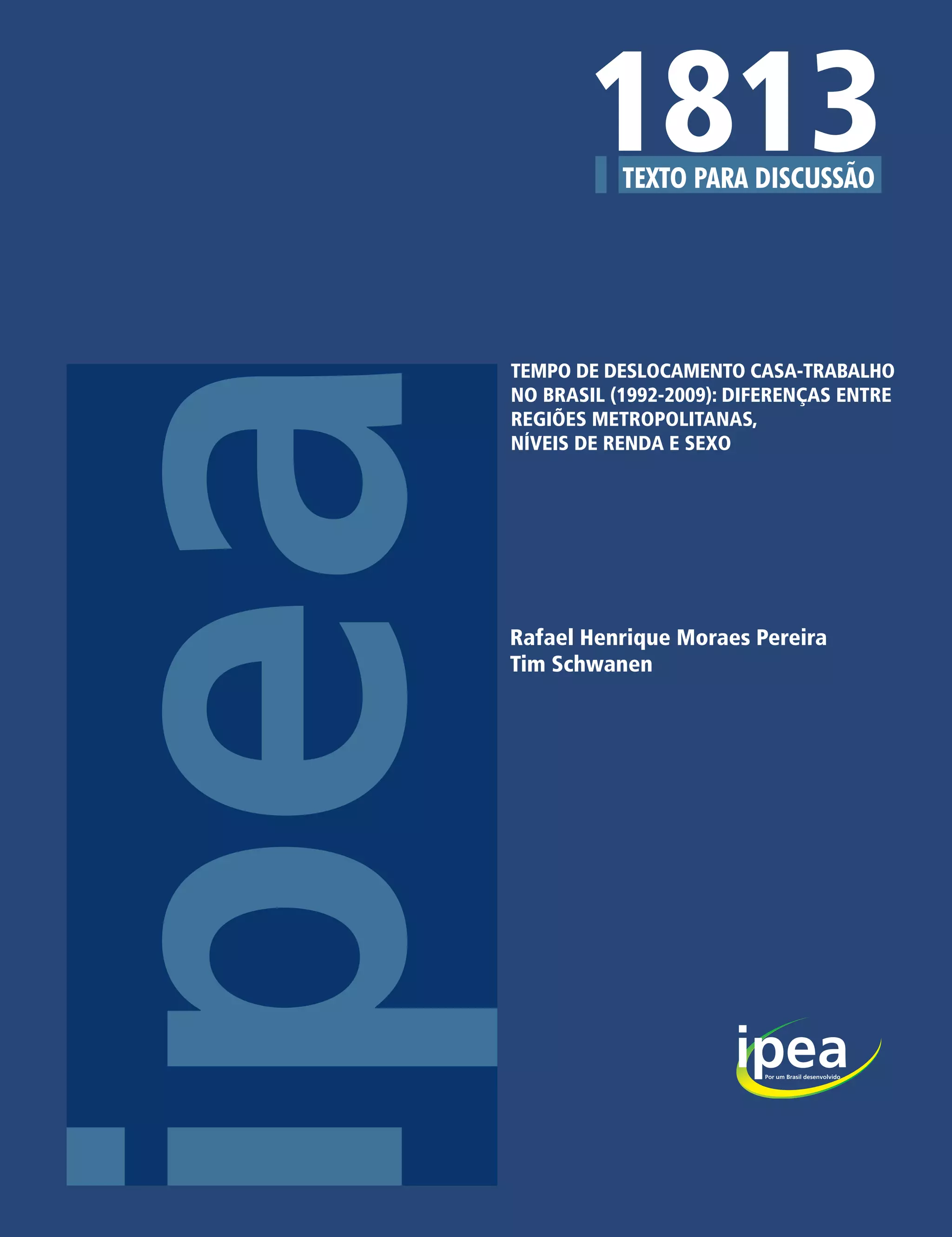 Este documento analisa as tendências no tempo médio de deslocamento casa-trabalho no Brasil entre 1992 e 2009, distinguindo entre as nove maiores regiões metropolitanas e o Distrito Federal e descrevendo como as diferenças entre estas áreas variam de acordo com os níveis de renda e sexo. Os principais resultados são: i) o tempo de deslocamento casa-trabalho é 31% maior em São Paulo e Rio de Janeiro do que nas outras regiões; ii) os trabalhadores de baixa renda gastam 20% mais tempo do que os mais ricos; e iii) as