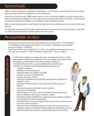 O documento descreve a missão e objetivos do Instituto de Pesquisas e Estudos dos Trabalhadores (IPET), que é fornecer educação, pesquisa e assessoramento técnico para trabalhadores, com foco em desenvolvimento de políticas públicas para camadas de baixa renda. O IPET oferece cursos de formação sindical, qualificação profissional e pesquisas relacionadas ao trabalho.