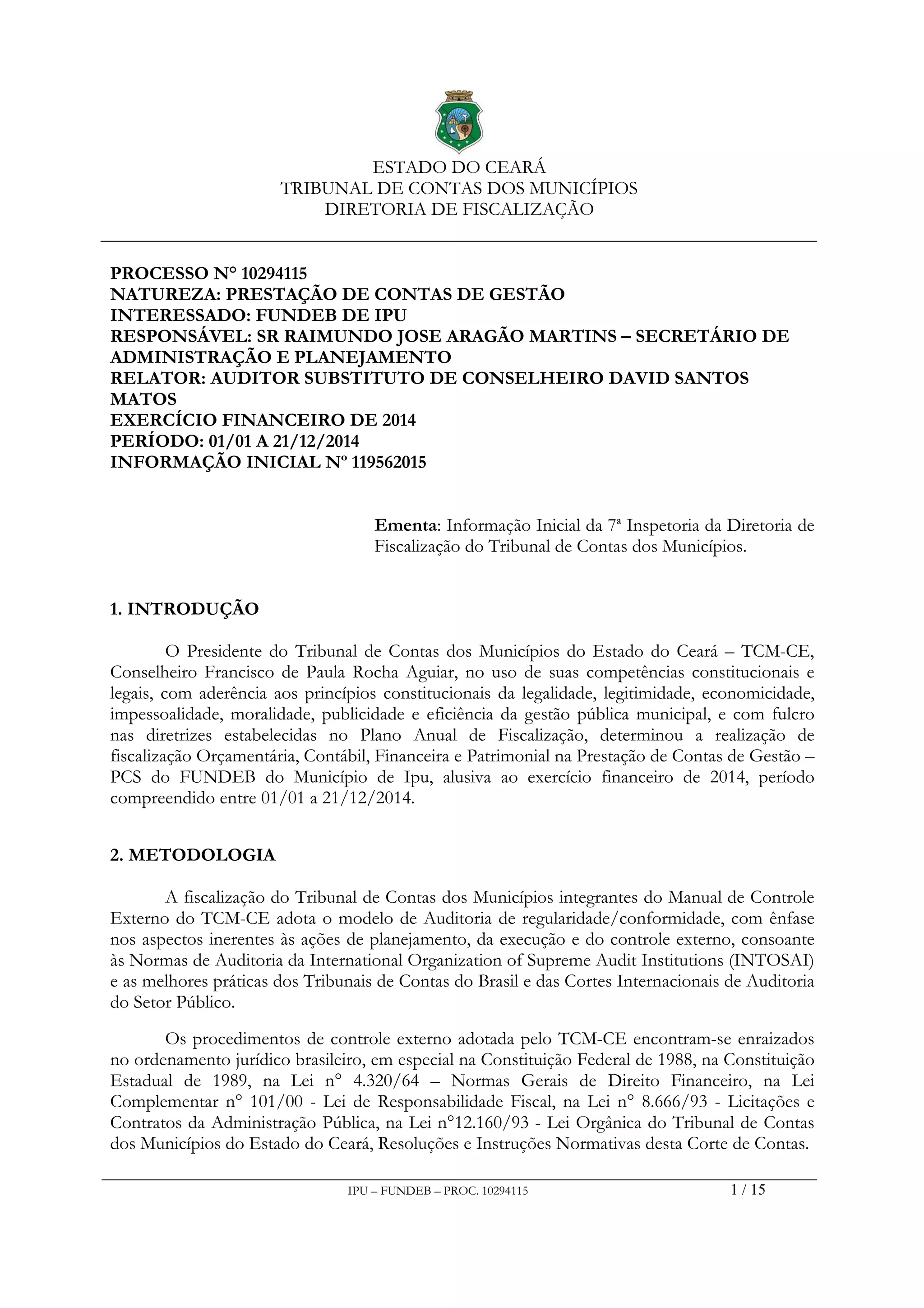 Este documento é um relatório de auditoria do Tribunal de Contas dos Municípios do Estado do Ceará sobre a prestação de contas de gestão do FUNDEB do município de Ipu referente ao exercício de 2014. O relatório aponta inconsistências nas peças apresentadas e divergências entre os dados apresentados e os registros do sistema de informações municipais. Também verificou repasses a menor e a maior em algumas contas extraorçamentárias.