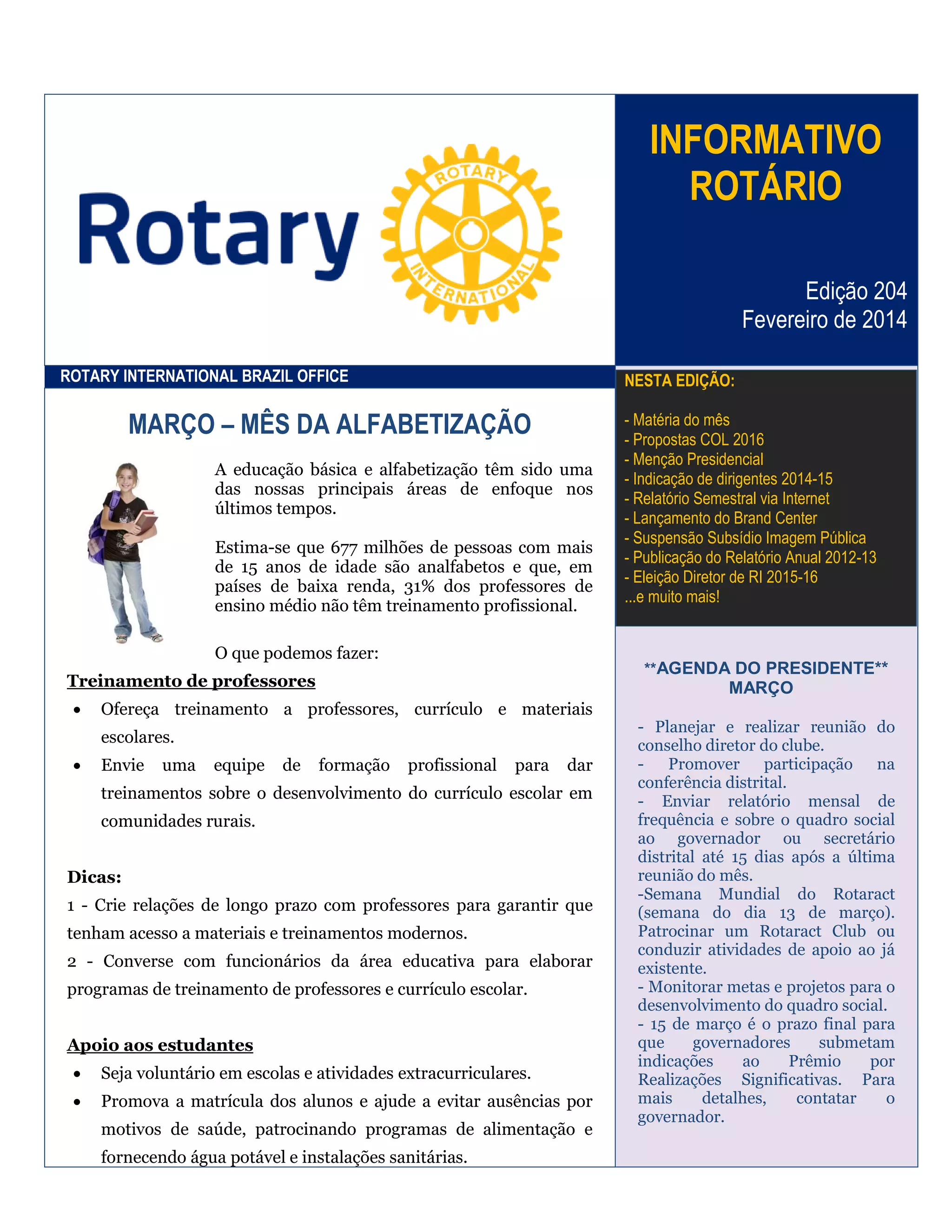 O boletim informativo do Rotary International Brazil Office destaca as seguintes informações para fevereiro de 2014: 1) Março é o mês da alfabetização com foco em treinamento de professores e apoio aos estudantes; 2) A agenda do presidente para março inclui conferências sobre novas gerações, envio de relatórios e indicação de dirigentes; 3) As propostas para o Conselho Legislativo de 2016 devem ser enviadas até dezembro de 2014.