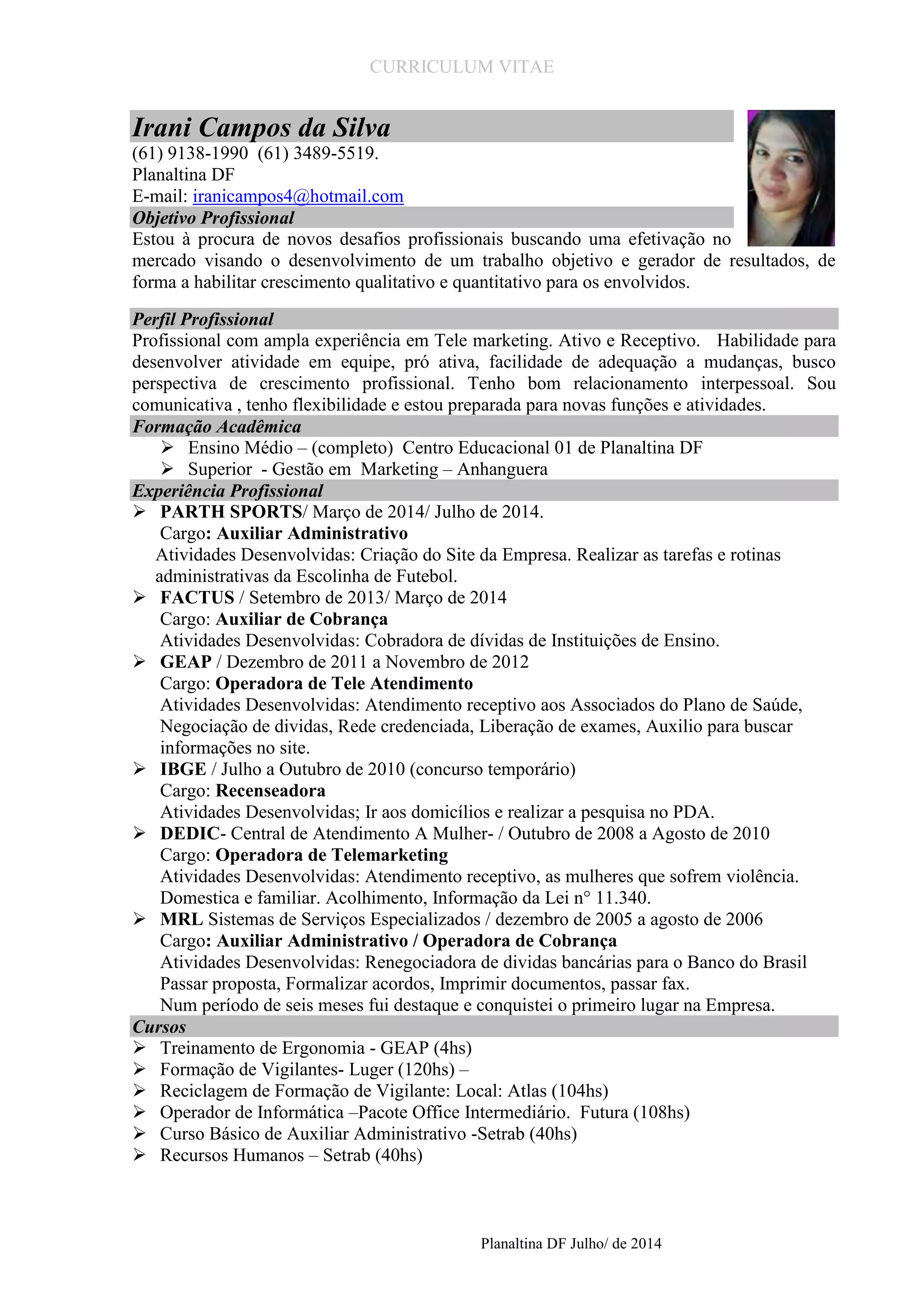 Irani Campos da Silva está procurando novas oportunidades profissionais e oferece experiência em telemarketing, atendimento ao cliente, cobrança e administração. Ela tem formação em gestão de marketing e cursos complementares em ergonomia, informática e recursos humanos. Sua experiência profissional inclui cargos como auxiliar administrativo, cobradora e operadora de teleatendimento em diversas empresas.