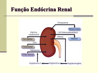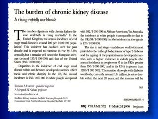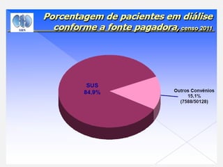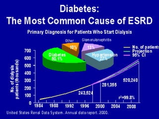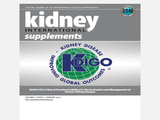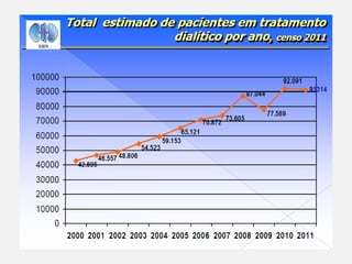 O documento descreve a doença renal crônica (DRC), definindo-a como uma perda progressiva e insidiosa da função renal. Apresenta suas principais causas, como diabetes e hipertensão, e aborda os mecanismos fisiopatológicos de progressão da doença e as adaptações renais que ocorrem. Também descreve os principais sintomas e complicações da DRC, além de apresentar a classificação e as opções de tratamento disponíveis.