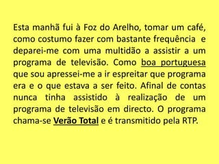 Irina foi à praia de Foz do Arelho e encontrou uma multidão assistindo a uma gravação ao vivo do programa de TV Verão Total na RTP. Ela gostou de assistir à experiência de gravação de um programa de TV ao vivo pela primeira vez. Irina também aprecia o privilégio de poder trabalhar sem horários fixos ou patrões, o que lhe dá alegria e liberdade para organizar seu trabalho.