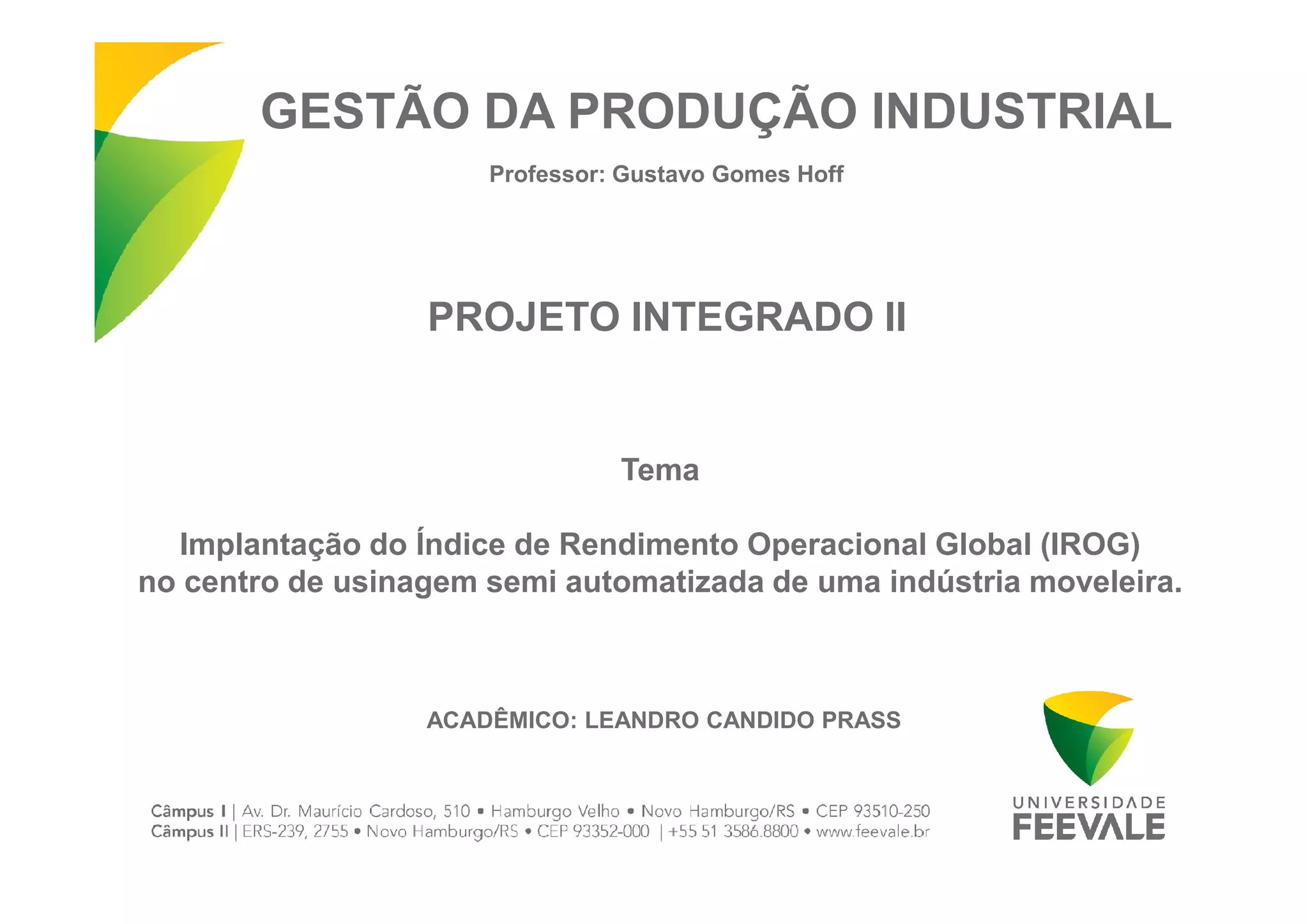 O documento discute a implantação do Índice de Rendimento Operacional Global (IROG) em uma indústria moveleira para aumentar a produtividade. A justificativa é a necessidade de reduzir custos em um mercado competitivo. O projeto visa medir os indicadores de tempo operacional, desempenho e qualidade para diagnosticar oportunidades de melhoria, como reduzir tempo ocioso e manutenção.