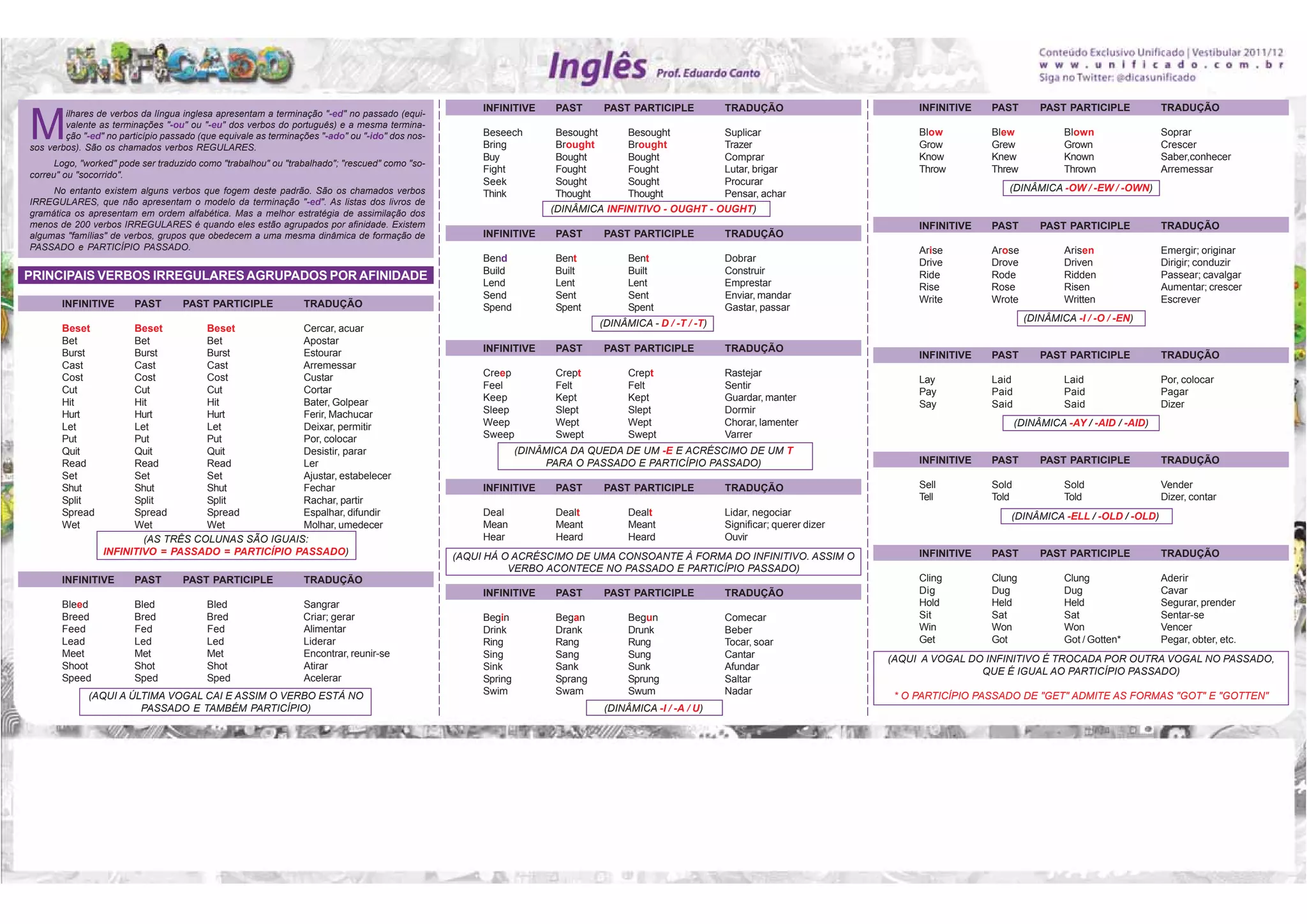 O documento resume os principais verbos irregulares do inglês agrupados por similaridade de conjugação no passado e particípio passado. Apresenta vários grupos de verbos que seguem padrões como a troca de vogais ou a adição de letras na forma do passado. Fornece exemplos de verbos irregulares e suas traduções para o português nas três colunas de infinitivo, passado e particípio passado.