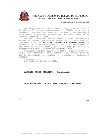 O Tribunal de Contas do Estado de São Paulo julgou improcedente uma representação e irregular um pregão e contrato realizados pela Prefeitura Municipal de Guarulhos. O Tribunal também aplicou multa ao Secretário de Transportes e Trânsito e recomendou que a prefeitura estabeleça os serviços de cada etapa do cronograma de desembolso em futuros editais.