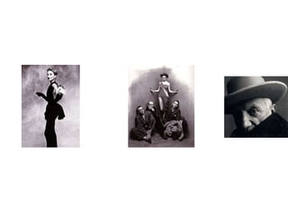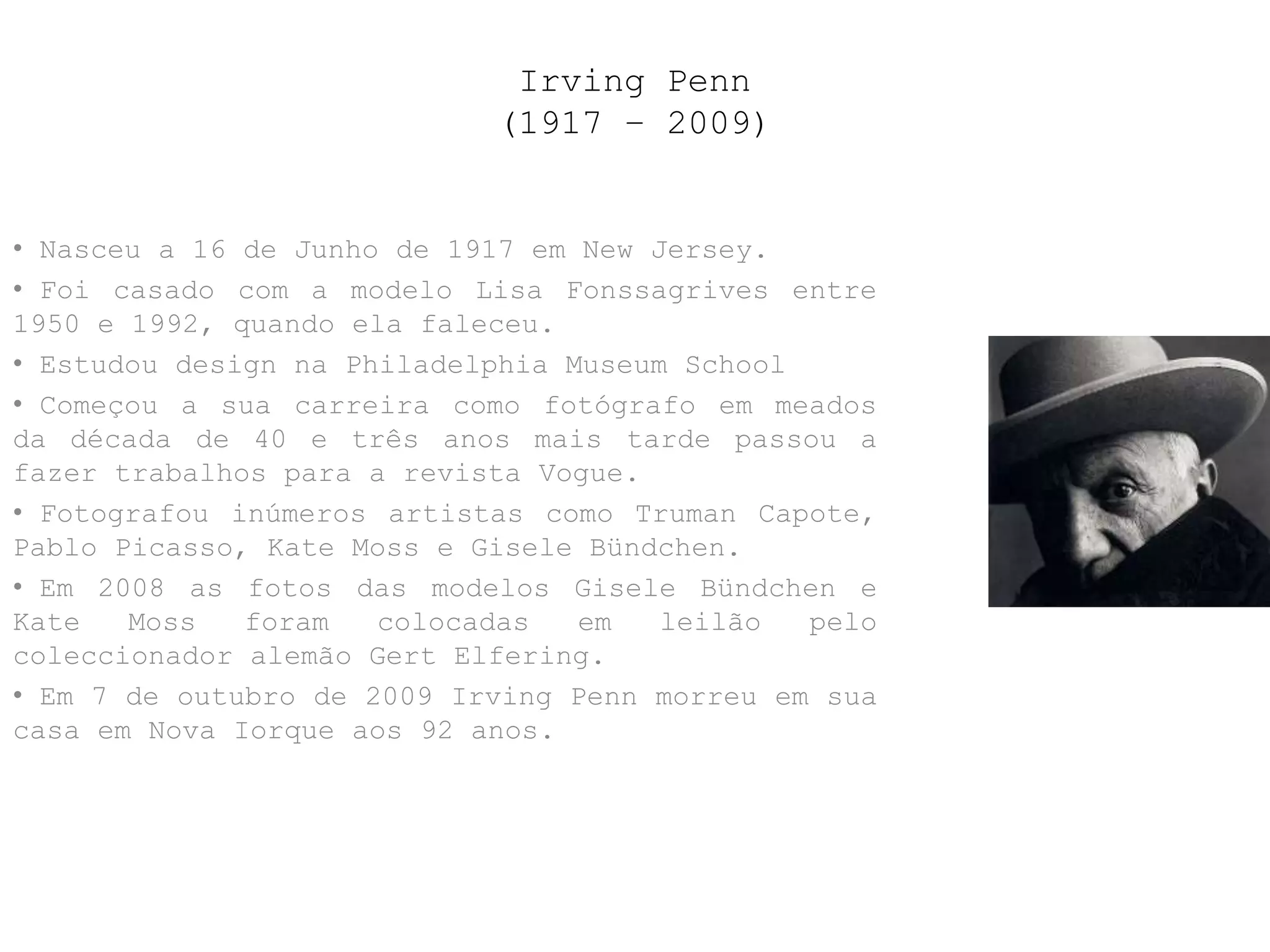 Irving Penn (1917-2009) foi um fotógrafo americano reconhecido por seus retratos de celebridades e modelos. Estudou design e começou sua carreira na década de 1940, trabalhando para a Vogue. Fotografou figuras como Picasso, Capote e Gisele Bündchen utilizando fundos neutros e ângulos incomuns. Considerado um mestre da fotografia, contribuiu para elevar a fotografia à categoria de arte.
