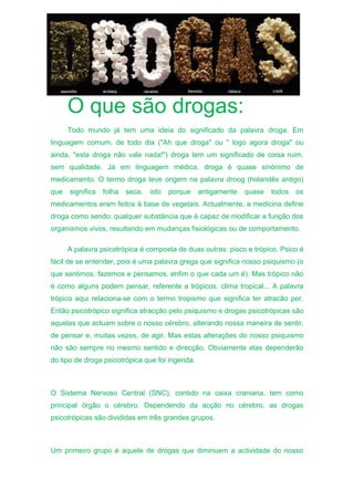 O documento discute o significado de drogas e como elas afetam o cérebro. É dividido em três seções: a primeira define drogas e explica como elas são classificadas de acordo com seu efeito no cérebro; a segunda seção descreve alguns tipos específicos de drogas; a terceira seção lista consequências do uso de estimulantes e drogas alucinógenas.