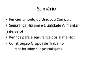 O documento apresenta uma aula introdutória sobre segurança alimentar. Apresenta o funcionamento da unidade curricular com dois módulos, um sobre pré-requisitos do HACCP e outro sobre implementação do HACCP. Também discute perigos para a segurança dos alimentos e constituição de grupos de trabalho para analisar perigos biológicos.