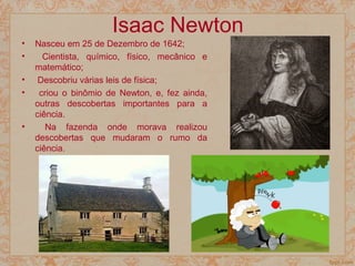 O documento descreve as biografias e realizações científicas de Isaac Newton e René Descartes, dois importantes cientistas e filósofos. Newton desenvolveu leis fundamentais da física e inventou o telescópio refletor, enquanto Descartes formulou o método científico moderno e é conhecido pela frase "Penso, logo existo". Ambos tiveram contribuições significativas para a ciência e filosofia.