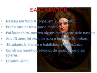 1) O documento descreve as vidas e contribuições científicas de Isaac Newton, Robert Hooke e Edmond Halley, reconhecidos físicos do século XVII.
