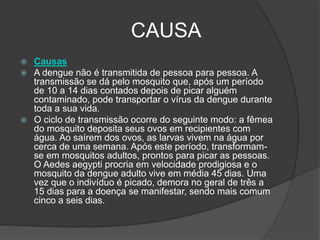 O documento descreve o ciclo de transmissão da dengue, que ocorre quando o mosquito Aedes aegypti picado por alguém infectado transmite o vírus para outras pessoas após 10-14 dias. Os sintomas da dengue clássica incluem febre alta, dor de cabeça e manchas na pele. A dengue hemorrágica pode causar sangramentos. A prevenção envolve eliminar locais com água parada para impedir a reprodução do mosquito.