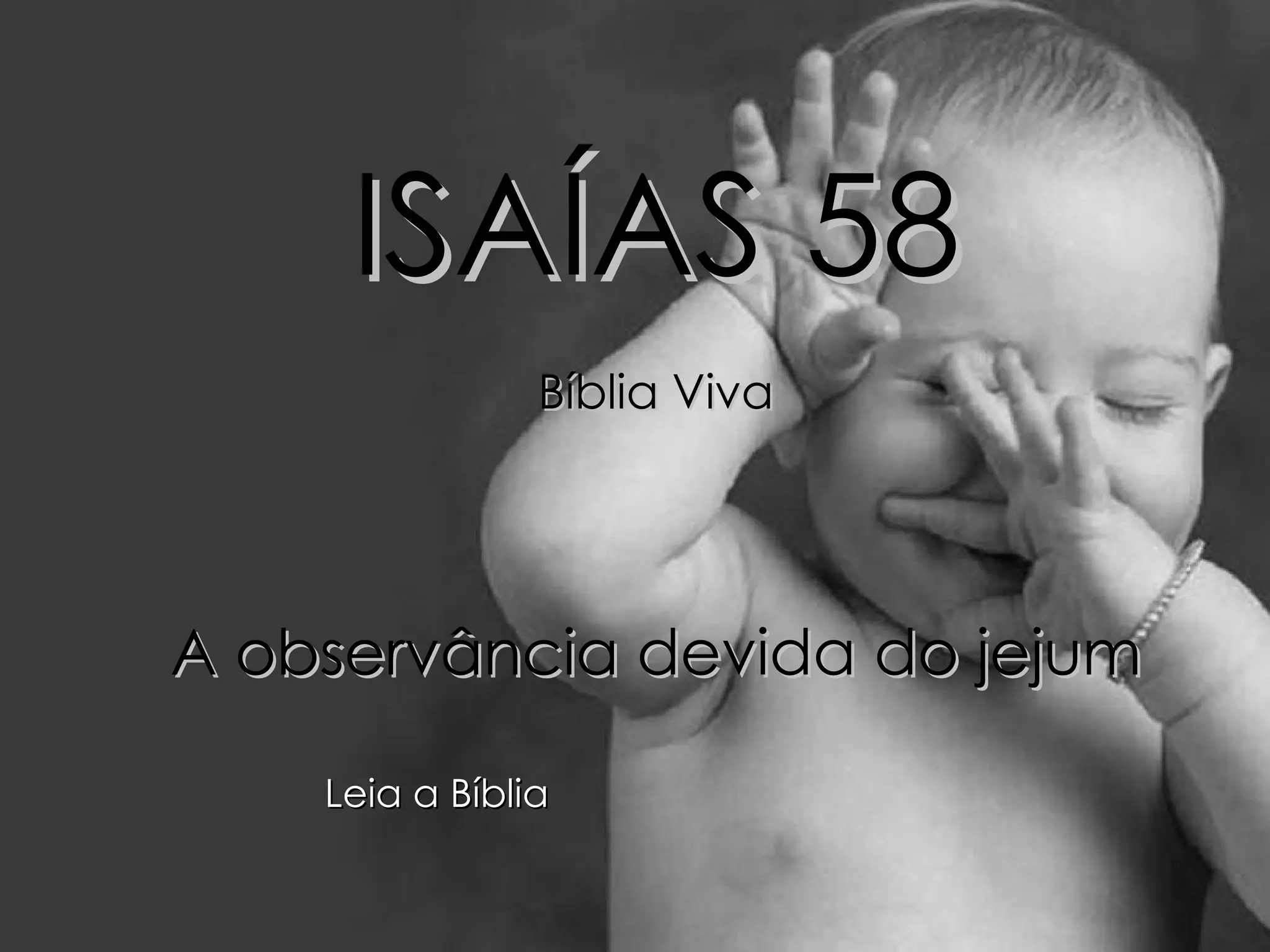 O texto discute a observância devida do jejum segundo Deus. Ele critica os israelitas por jejuarem apenas externamente enquanto oprimem os empregados e brigam. Deus prefere que ajudem os necessitados, perdoem dívidas, não forcem o trabalho escravo e sejam justos. Se fizerem isso, Ele os abençoará e curará.