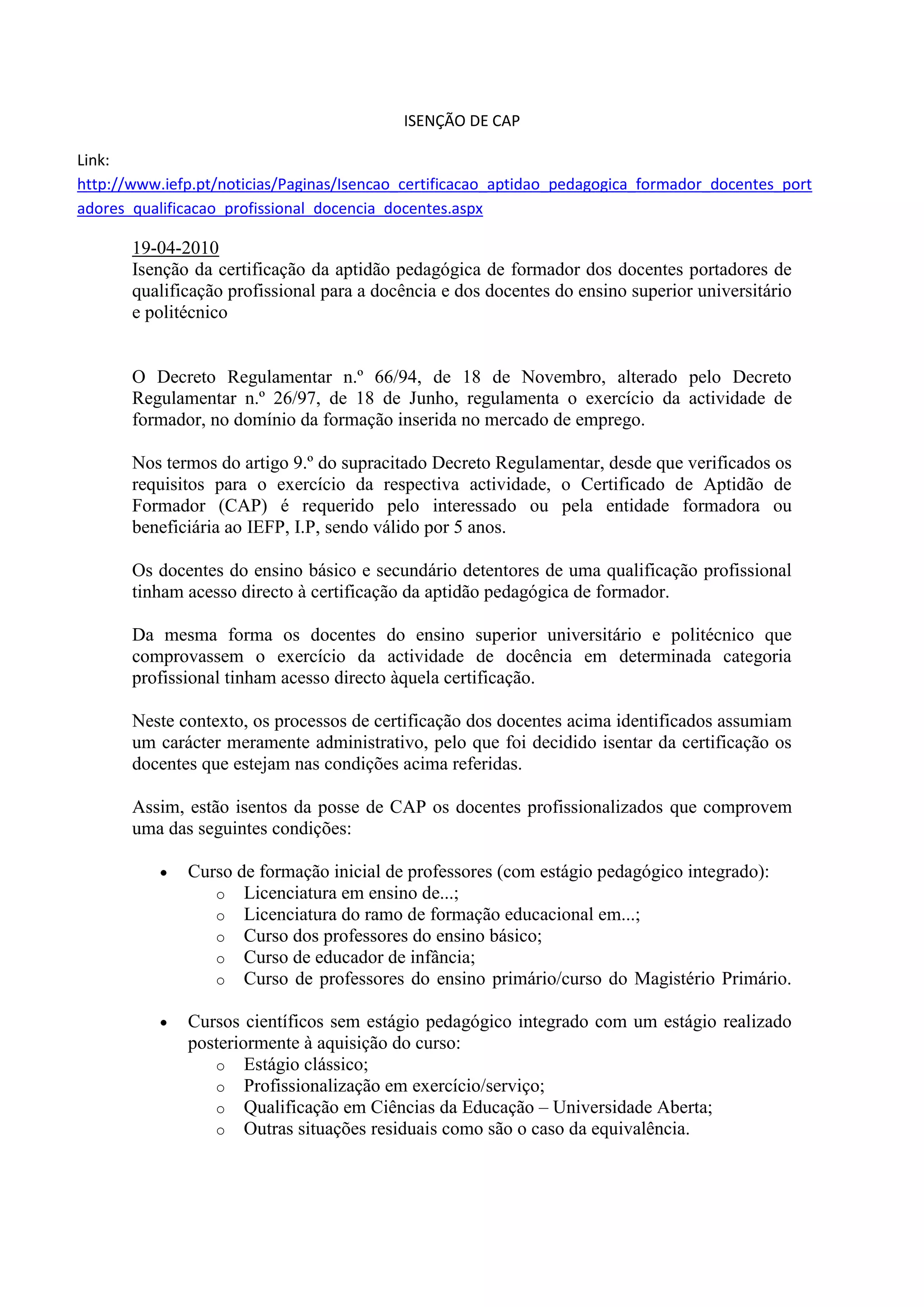 Este documento descreve a isenção da certificação da aptidão pedagógica de formador para dois grupos de docentes em Portugal: 1) Docentes do ensino básico e secundário com qualificação profissional para a docência, e 2) Docentes do ensino superior universitário e politécnico. Estes docentes estão isentos de obter o Certificado de Aptidão de Formador se provarem que possuem a qualificação ou que fazem parte dos quadros docentes de uma instituição de ensino superior.