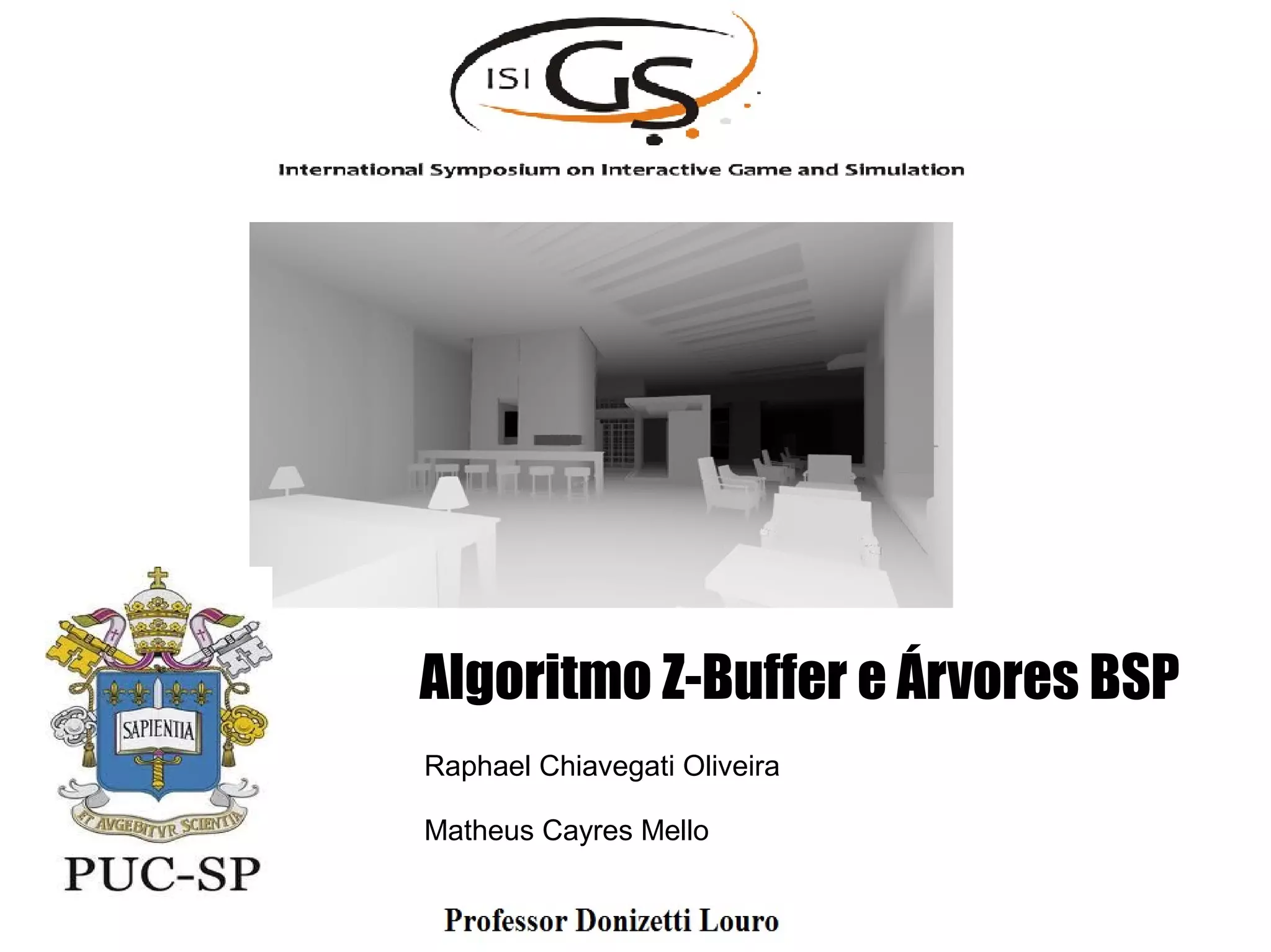 O documento aborda o algoritmo z-buffer, criado por Edwin Catmull, detalhando suas vantagens e desvantagens, além de apresentar um exemplo prático em 'Tomb Raider 2'. Também discute as árvores BSP, um método de particionamento binário de espaço, com foco em suas aplicações na renderização rápida e os desafios no pré-cálculo. Ambas as técnicas são essenciais em computação gráfica para melhorar a eficiência na renderização de cenas complexas.