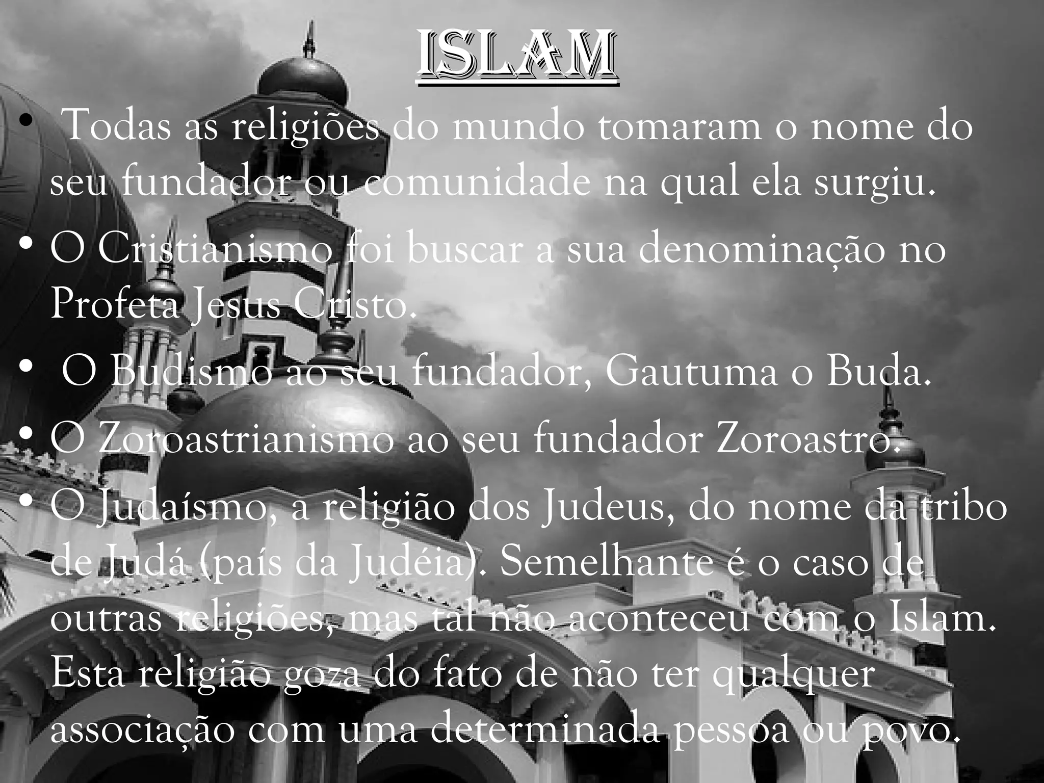 O documento discute a origem e história do Islã, desde o profeta Maomé até os dias atuais. Apresenta os principais eventos como a Hégira, a expansão do califado islâmico sob os califas Abu Bakr e Umar, a compilação do Alcorão, as Cruzadas, o Império Otomano e a expulsão dos muçulmanos da Espanha pelos Reis Católicos. Também define termos como Islã, muçulmano e Alá, e lista os seis principais profetas segundo a fé is