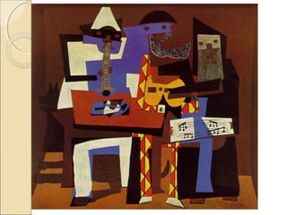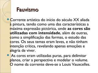 O documento descreve vários movimentos artísticos europeus do início do século XX, incluindo o Fauvismo, Cubismo e Futurismo. O Fauvismo se caracterizava pela ênfase na cor pura e formas simplificadas. O Cubismo decompunha figuras em formas geométricas para diferentes pontos de vista. O Futurismo celebrava a velocidade, a tecnologia moderna e a revolução, e desejava demolir museus e bibliotecas.