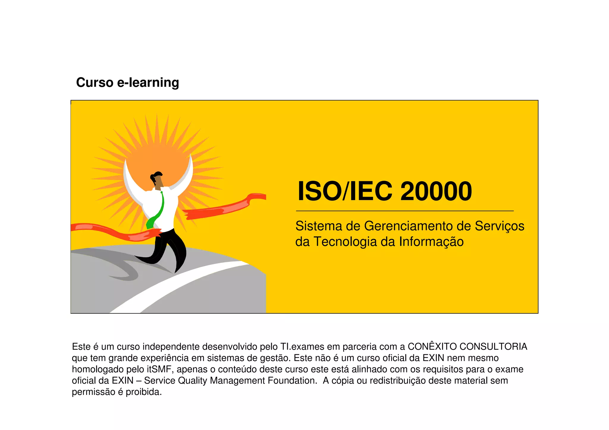 Este curso fornece uma visão geral da norma ISO/IEC 20000 e como ela se aplica a sistemas de gerenciamento de serviços de TI. O curso aborda objetivos como entender a norma ISO/IEC 20000, seus processos e requisitos, as etapas de implementação de um sistema de gerenciamento de serviços de TI e o processo de certificação. O curso é composto por 7 módulos que cobrem tópicos como introdução à norma, estrutura da norma, planejamento e implementação, processos de entrega de servi