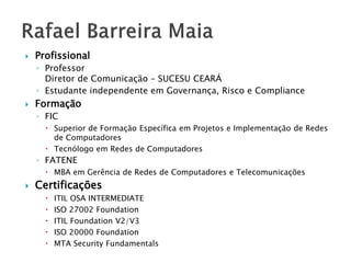 O documento apresenta informações sobre a norma NBR ISO/IEC 27001. Ela define os requisitos para estabelecer, implementar, operar, monitorar, revisar, manter e melhorar um sistema de gestão de segurança da informação. A norma tem como objetivo ajudar as organizações a adotarem modelos adequados para lidar com segurança da informação de forma sistemática.