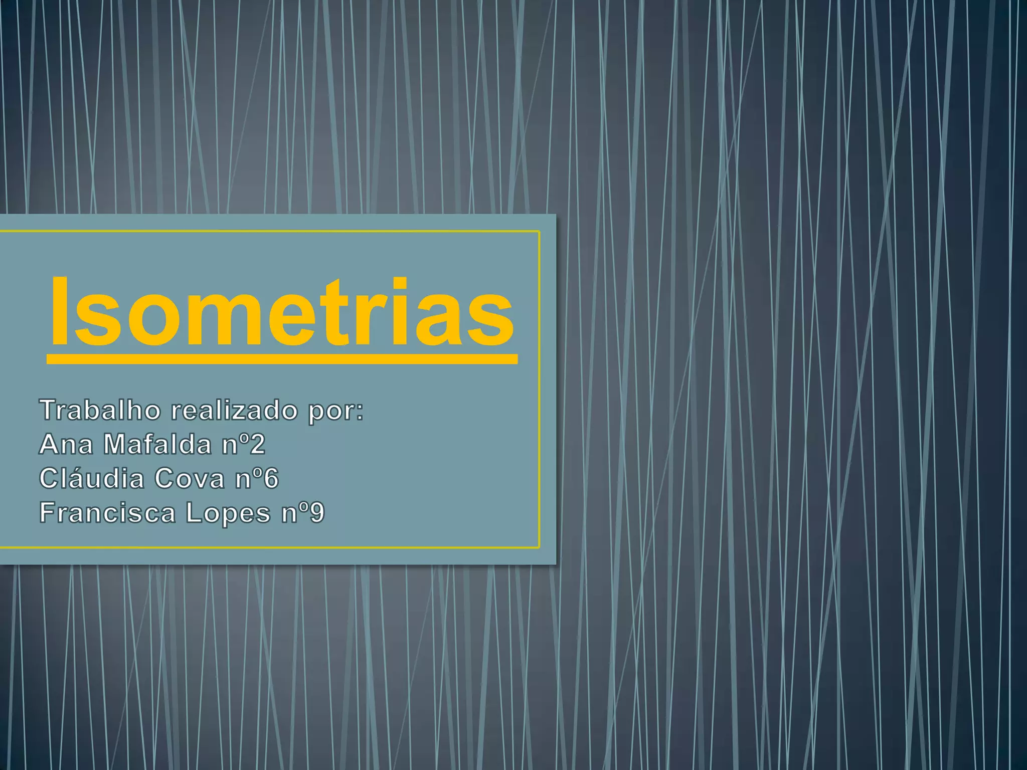 O documento discute tipos de isometrias no plano, incluindo translações, reflexões e rotações. Também aborda simetrias de figuras geométricas e diferentes tipos de padrões e frisos que podem ser formados por combinações dessas isometrias.