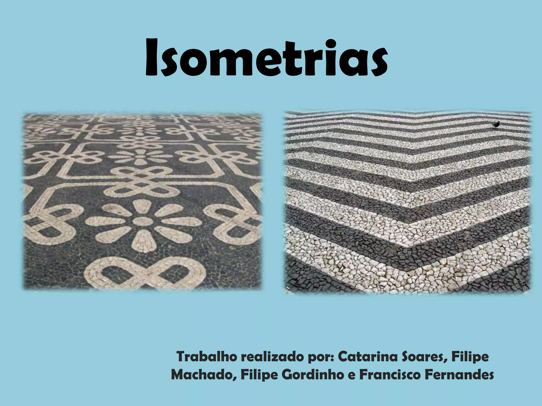 O documento discute os conceitos de isometrias, incluindo reflexão, reflexão deslizante, rotação, simetrias e padrões. Exemplos ilustram como essas transformações geométricas preservam distâncias e ângulos. Rosáceas, frisos e pavimentações são discutidos como aplicações dessas isometrias.