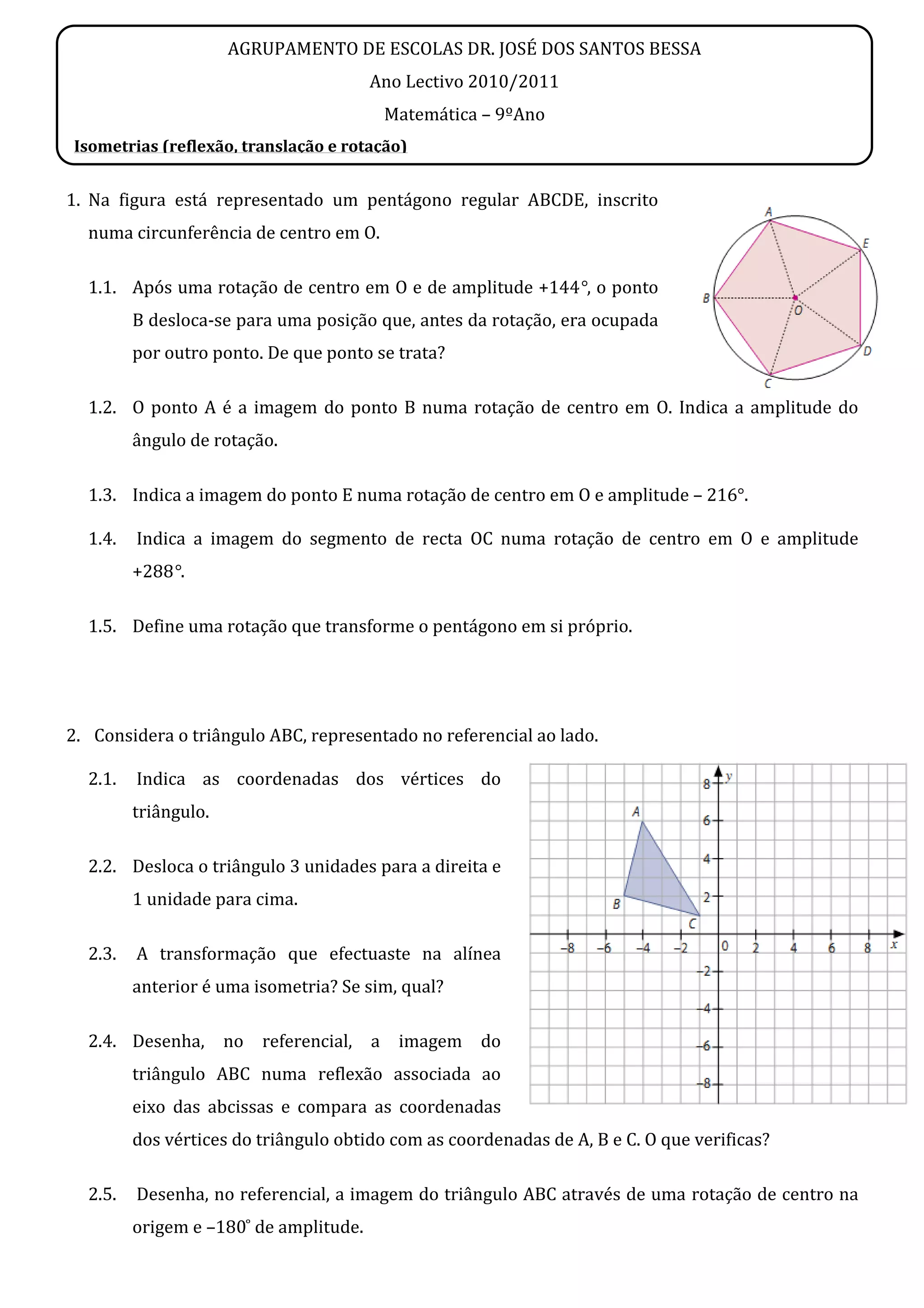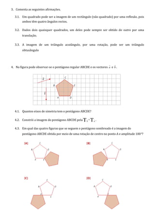 1) O documento apresenta exercícios sobre isometrias geométricas como rotações, translações e reflexões aplicadas a figuras planas como triângulos, quadrados e pentágonos.