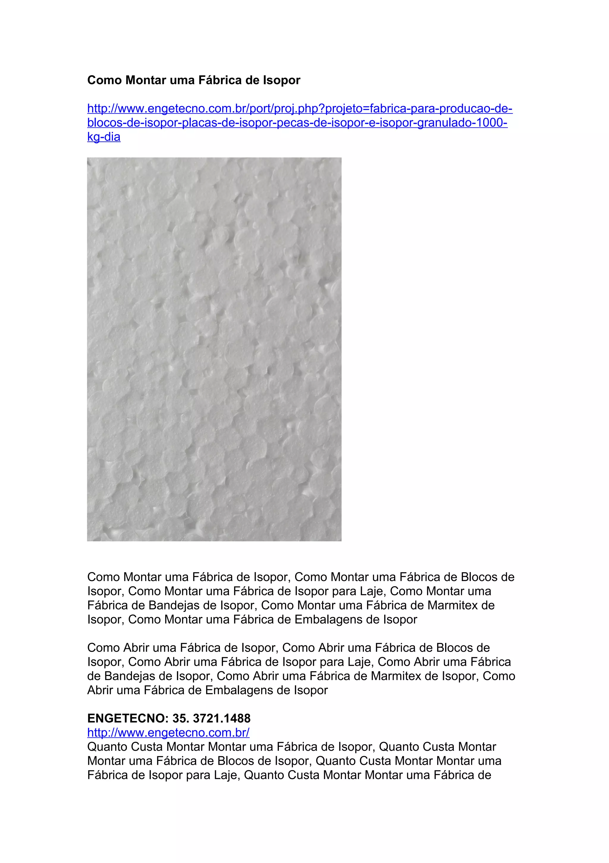 O documento fornece instruções para montar uma fábrica de isopor, descrevendo o processo de fabricação do isopor, os equipamentos necessários e as etapas como recepção de matérias-primas, fabricação, estocagem e escritórios. Recomenda-se um galpão de pelo menos 100m2 e lista exemplos de produtos feitos de isopor.