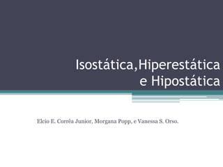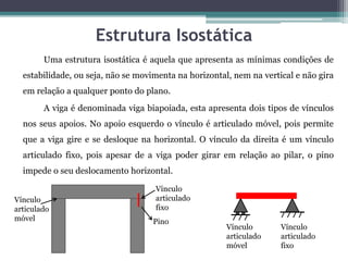 O documento descreve três tipos de estruturas: isostáticas, hiperestáticas e hipostáticas. Estruturas isostáticas possuem apenas as condições mínimas para estabilidade. Estruturas hiperestáticas têm redundância estrutural e hipostáticas não possuem equilíbrio estático e podem se mover.