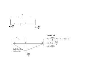 O documento discute conceitos fundamentais de estática aplicados a vigas isostáticas, incluindo equações para calcular esforços internos como momento fletor e cortante. Ele apresenta diagramas de momento fletor e esforço cortante para vigas bi-apoiadas sob carga concentrada, mostrando como esses esforços variam ao longo da viga.