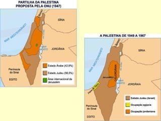 3) Em 1947, a ONU aprovou a partilha da região em dois estados, mas os árabes rejeitaram a proposta, dando início a vários conflitos entre israelenses e países árabes.