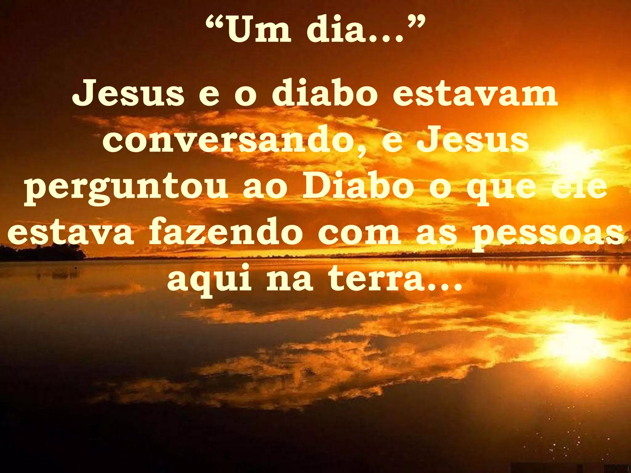 Jesus conversa com o diabo, que afirma divertir-se ensinando pessoas a fazer coisas ruins. Jesus pergunta quanto o diabo quer por essas pessoas, mas o diabo diz que elas são traiçoeiras e não amarão Jesus. Apesar disso, Jesus paga o preço da liberdade delas com seu sangue. O texto reflete sobre como as pessoas falam pouco sobre Jesus, mas querem estar com Ele um dia.