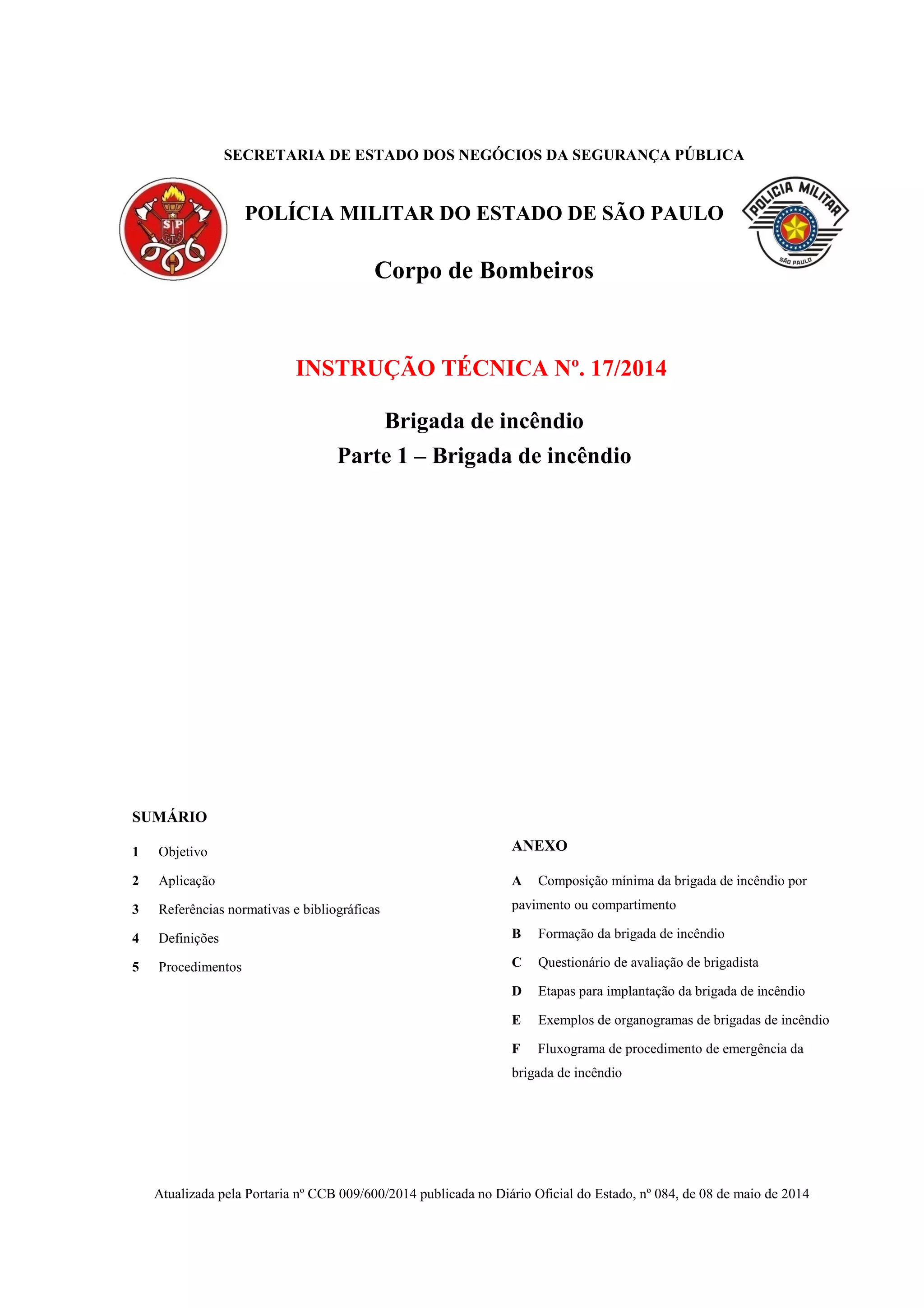Este documento estabelece diretrizes para a composição, formação, implantação, treinamento e atuação de brigadas de incêndio em edificações e áreas de risco no estado de São Paulo, com o objetivo de proteger vidas e patrimônio em caso de sinistro até a chegada do Corpo de Bombeiros.