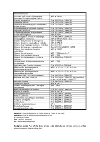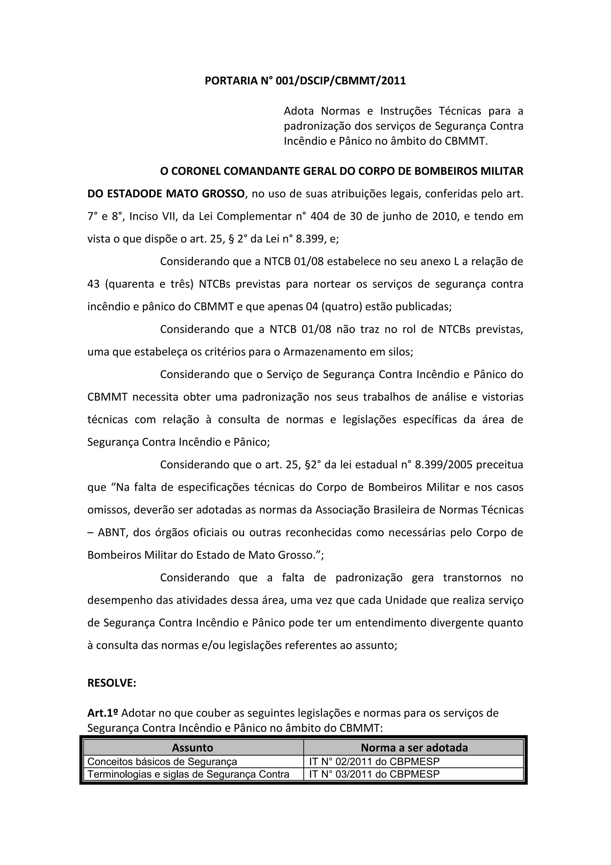 Esta portaria estabelece normas e instruções técnicas para padronizar os serviços de segurança contra incêndio e pânico no Corpo de Bombeiros Militar de Mato Grosso, adotando legislações e normas específicas para cada assunto relacionado à segurança contra incêndio. A portaria também inclui uma norma sobre armazenamento em silos, reconhecendo que a norma anterior não abordava este tópico.