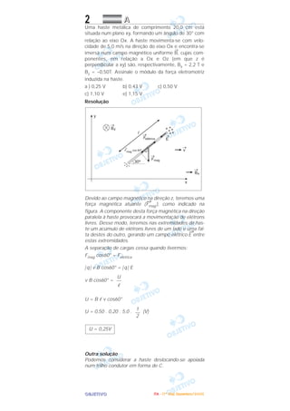 1) Uma haste metálica imersa em um campo magnético uniforme se movimenta, induzindo uma força eletromotriz em suas extremidades.