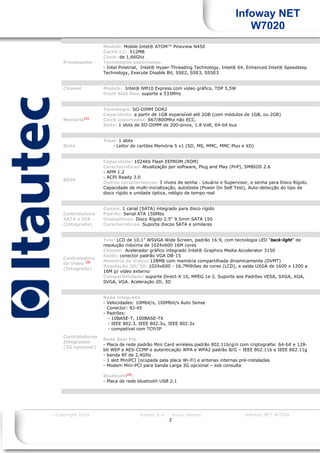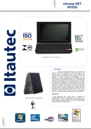 O documento descreve o notebook Infoway NET W7020 da Itautec, com ênfase em suas especificações técnicas. O notebook possui tela widescreen de 10,1 polegadas, processador Intel Atom N450 de 1,66GHz, até 2GB de RAM e bateria com autonomia de 3 horas. Ele oferece conectividade wireless, Bluetooth, leitor de cartões e portas USB para periféricos externos, em um design leve e fino.