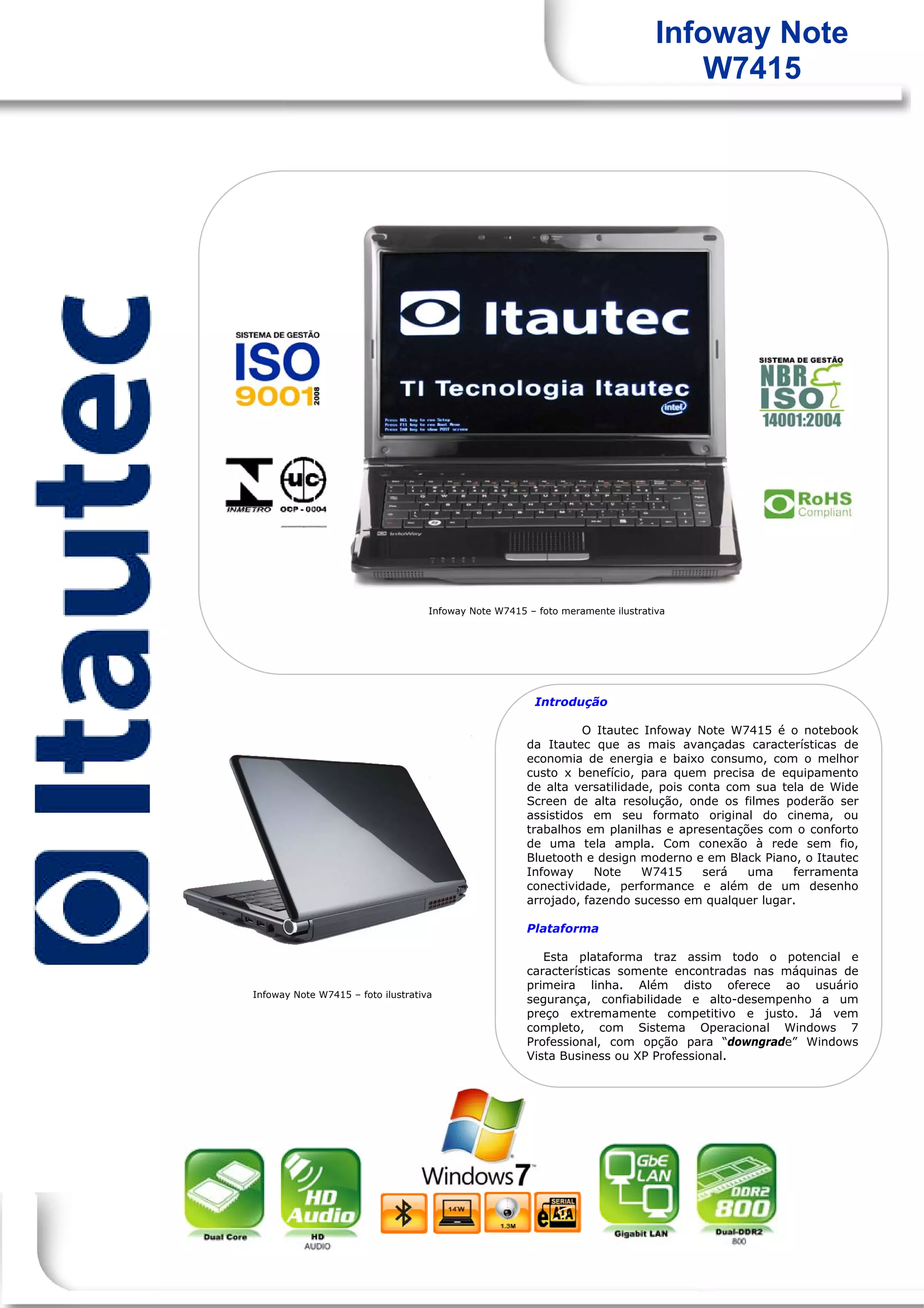 O documento descreve as especificações técnicas do notebook Itautec Infoway Note W7415. Ele possui tela widescreen de 14 polegadas, processador Intel Core 2 Duo, memória RAM de até 8GB, unidade óptica DVD, bateria com autonomia de 2 horas e sistema operacional Windows 7 ou Linux. O documento detalha ainda suas portas, controles, dimensões e outros recursos.