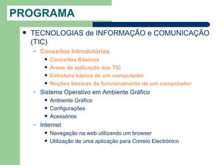 Este documento fornece uma introdução às Tecnologias de Informação e Comunicação (TIC). Resume os principais conceitos das TIC, incluindo informática, burótica, telemática e controle e automação. Também descreve as unidades essenciais do programa, como conceitos introdutórios, sistemas operacionais, internet, processamento de texto e criação de apresentações.