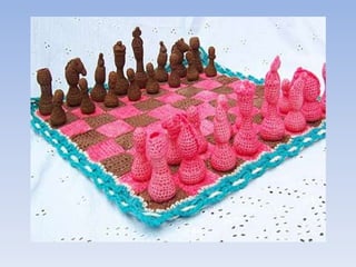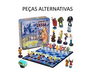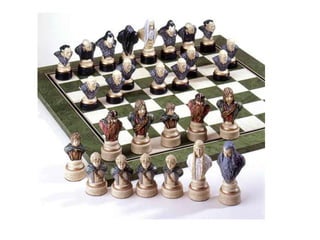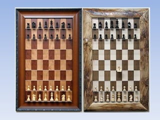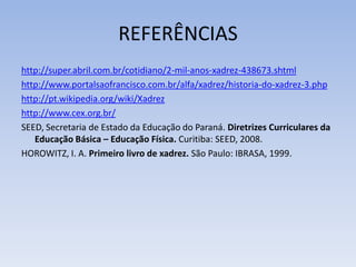O documento discute a história e conceitos fundamentais do xadrez. Ele descreve como o xadrez evoluiu da Índia antiga para a Europa medieval, ganhando as regras atuais. Também explica os movimentos de cada peça e estratégias como roque, promoção e en passant.