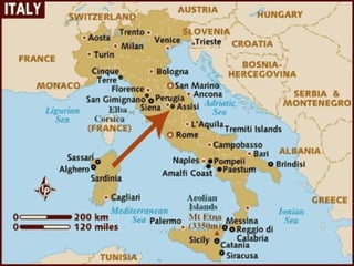 O documento fornece um resumo histórico da formação da Itália moderna entre os séculos XIX e XX, destacando três pontos: 1) A unificação da Itália sob o Reino da Casa de Sabóia entre 1850 e 1861, com Florença e depois Roma como capitais; 2) O papel do revolucionário Giuseppe Garibaldi na luta pela unificação entre 1850 e 1870; 3) A transformação de Milão em importante centro financeiro e industrial do norte da Itália a partir do final do século XIX.