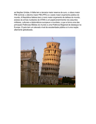 A Itália é uma república parlamentar unitária localizada no centro-sul da Europa, com Roma como sua capital. Ao longo de sua história, a Itália foi fragmentada em vários reinos e cidades-estados, mas foi unificada em 1861. Atualmente, a Itália é uma república democrática membro fundador da União Europeia, com um alto padrão de vida e um dos maiores PIBs do mundo.